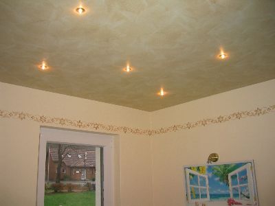 Im Flur-, Umkleide- und Ruheraumbereich haben wir die Decken mit Lasurtechnik gestaltet. Außerdem wurden die Wände mit Schablonierarbeiten verziert.